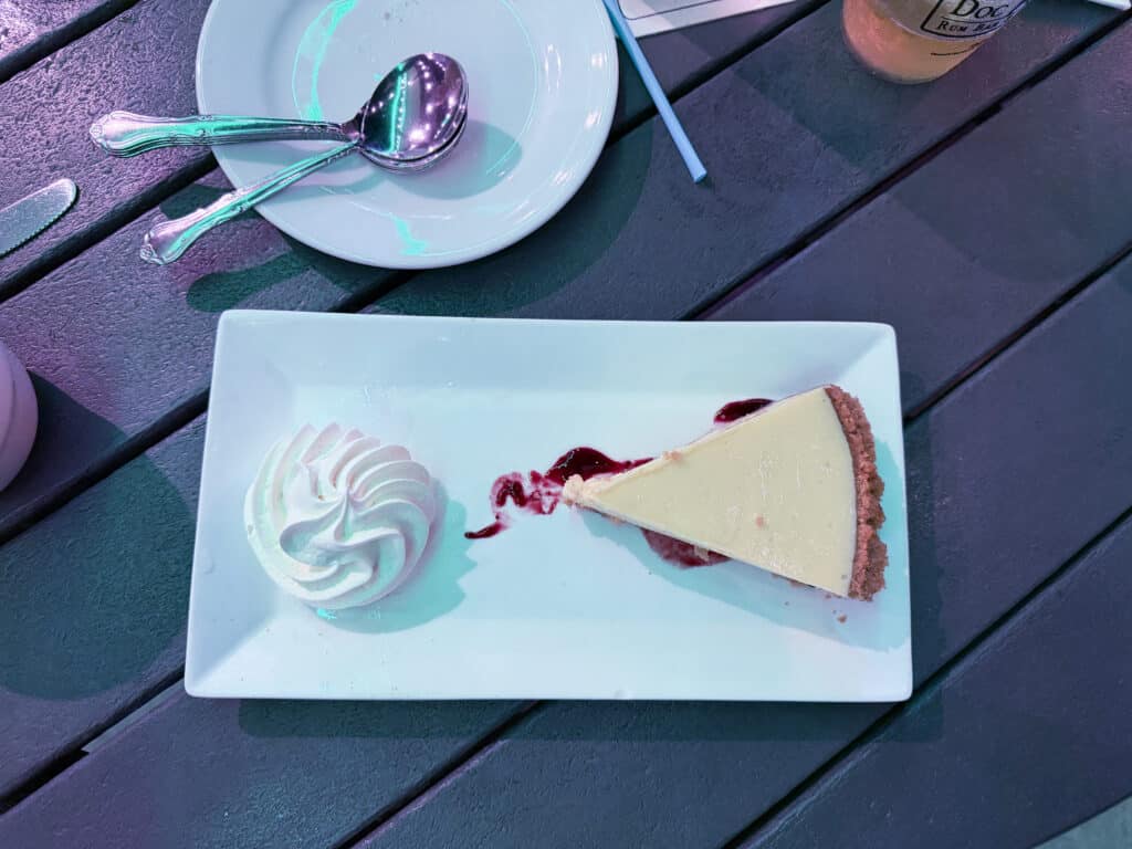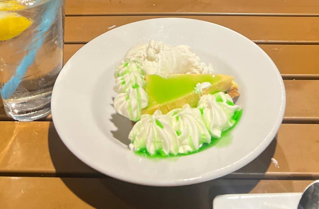 Crust is thicker and still has a little crunch. Pie consistency is really good. Love that the whipped cream is on the side. Not tart enough at all. Didn’t like the raspberry under it.